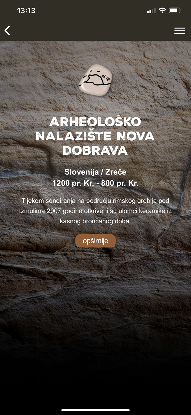 Isporučena je mobilna aplikacija za pametne telefone i tablete s elementima gamifikacije, koja će cjelovito interpretirati prapovijesno razdoblje u geografskom području koje obuhvaća općine Donja Voća i Turopolje u Hrvatskoj, te Zreče i Radence u Sloveniji. Aplikacija prikazuje sadržaj na dva jezika (hrvatski i slovenski) te je dostupna na Android i iOS platformama.