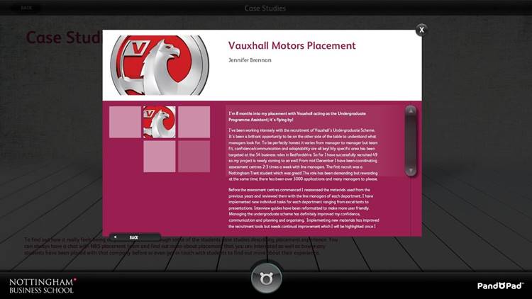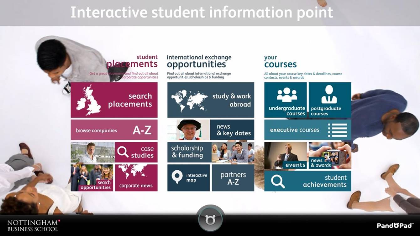 Razvijene su posebne aplikacije za potrebe jedinstvene info točke za studente. U roku od nekoliko sekundi studenti mogu pretražiti trenutne ponude studentskih poslova, informacije o svojim predmetima i nastavnicima, mogućnosti studentske razmjene, te informacije o nadolazećim događajima. Sve se to prikazuje putem interaktivnih zaslona osjetljivih na dodir pomoću naših Pandopad aplikacija.